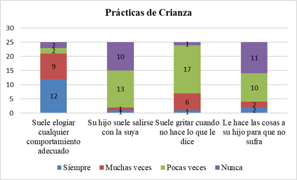 A los padres también se les cuestionó sobre las prácticas de crianza en casa, se descubrió que 21 de los padres respondieron que siempre o muchas veces elogian todo comportamiento adecuado de su hijo. Los padres revelaron que hay ocasiones que sus hijos hacen lo que quieren o suelen “salirse con la suya”, fueron 15 de ellos y 10 que nunca sucede una situación así. Además, 7 de los padres participantes compartieron que cuando su hijo no hace lo que ellos les dicen, suelen enfadarse y gritarle, 17 mencionan que sí sucede, pero pocas veces y el resto que nunca. En la misma línea, se les preguntó a los padres si suelen hacerle las cosas que sus hijos les dicen que les cuestan para que no sufran, ante lo cual mencionan 4 que siempre o muchas veces, 10 pocas veces y 11 dijeron que nunca (Figura 3).