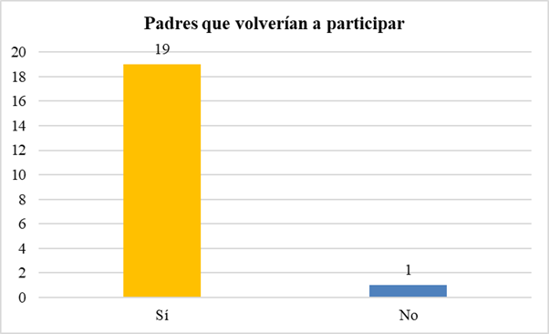A manera de conclusión, se puede decir que en la encuesta realizada a padres antes de la implementación del programa, se les cuestionó sobre la perspectiva que tenían de las Escuelas para Padres, 2 de ellos declararon que no encontraban algún tipo de beneficio en participar de un programa de este tipo, fue por ellos 2 que se asumió el reto de esta propuesta, con la mira en cambiar esta perspectiva. El contraste y la satisfacción de esta propuesta está en que, al concluir el programa, el 95% de los participantes externaron que volverían a participar en un programa como “Familias en Acción”; sólo un padre de familia externó que no, pero ya no por una visión tergiversada de los programas de Escuelas para Padres sino por cuestiones externas, como lo es el tiempo del que dispone para asistir.