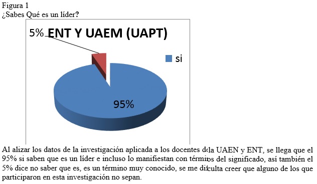 The study was descriptive and non-experimental transactional in nature, applying a leadership questionnaire to 100 undergraduate-level teachers at the UAEM University Center at Temascaltepec and a sample of 20 teachers at the Normal School of Tejupilco. The results revealed that 95% of the surveyed teachers claimed to know what a leader is, while the remaining 5% did not. Of the participants, 90% at UAEM and 80% at ENT consider themselves leaders.