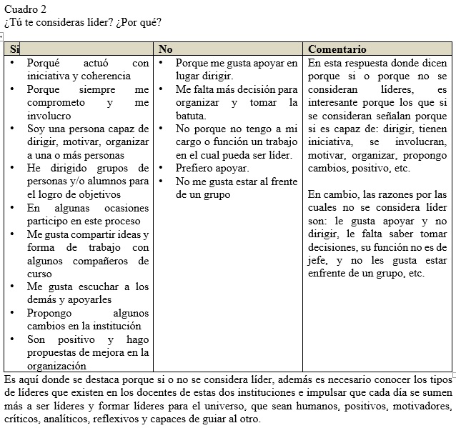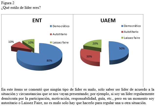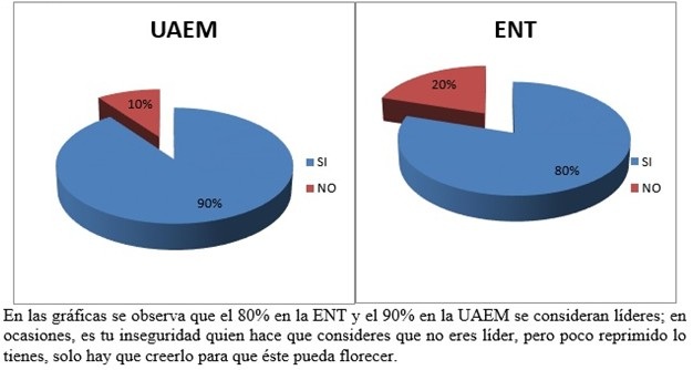 Al observar el proceso de la investigación y convivencia se percibe de acuerdo a los resultados en las dos escuelas de nivel superior que, si hay maestros líderes, mencionando que, en mayor porcentaje en la UAEM, que en la ENT, solo que algunos se ubican en su función y actúan como líderes, por su responsabilidad y nivel jerárquico en la estructura organizacional y también se detecta que a otros no les gusta ser líder.