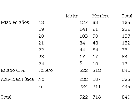 La muestra que se empleo fue no probabilística por conveniencia, teniendo algunos criterios de inclusión como ser estudiante formalmente inscrito, aceptar formar parte del estudio, manifestado a través de una carta de consentimiento. Se aplicaron los instrumentos a 935 estudiantes universitarios de licenciatura de una institución pública del Estado de México. 355 hombres y 580 mujeres, con un rango de edad de 17 a 29 años. Se revisó la base de datos en cuanto a casos perdidos y datos atípicos considerando algunas características como la edad y el estado civil. y las variables de estudios. Se procedió a eliminar los datos atípicos quedando la población con 840 casos. De los cuales 522 son mujeres y 318 hombres, todos ellos solteros, con un rango de edad de los 18 a los 24 años, 395 no realizan actividad física y 445 sí (Ver la Tabla 1).