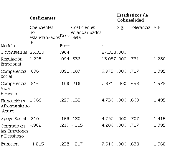 Predictores: (Constante), Evitación, Apoyo Social, Competencia Social, Regulación Emocional, Centrado en las Emociones y Desahogo, Planeación y Afrontamiento Activo, Competencias para la Vida y Bienestar