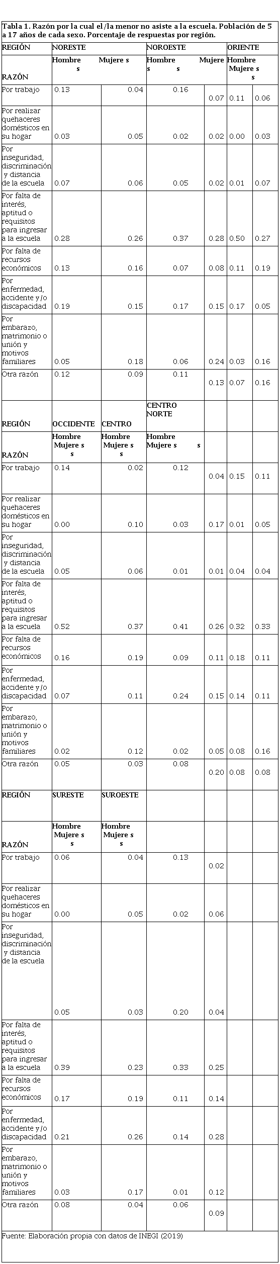 Las razones expresadas por la población femenina son más diversas. En seis de las ocho regiones la razón más frecuente para no asistir a la escuela fue por falta de interés, aptitud o requisitos para ingresar; en las regiones Sureste y Suroeste la principal razón fue por enfermedad, accidente o discapacidad. La segunda razón más frecuente en las regiones Noreste, Noroeste y Centro Norte fue el embarazo, matrimonio o unión y motivos familiares; en las regiones Oriente y Occidente fue la falta de recursos económicos; en la región Centro fue por realizar quehaceres domésticos en el hogar, y en las regiones Sureste y Suroeste fue la falta de interés, aptitud o requisitos para ingresar. La tercera razón más frecuente fue el embarazo, matrimonio o unión y motivos familiares en las regiones Oriente, Occidente y Sureste; la falta de recursos económicos lo fue en las regiones Noreste, Suroeste y Centro Norte y la enfermedad, accidente o discapacidad lo fue en las regiones Suroeste y Centro (INEGI, 2019).
