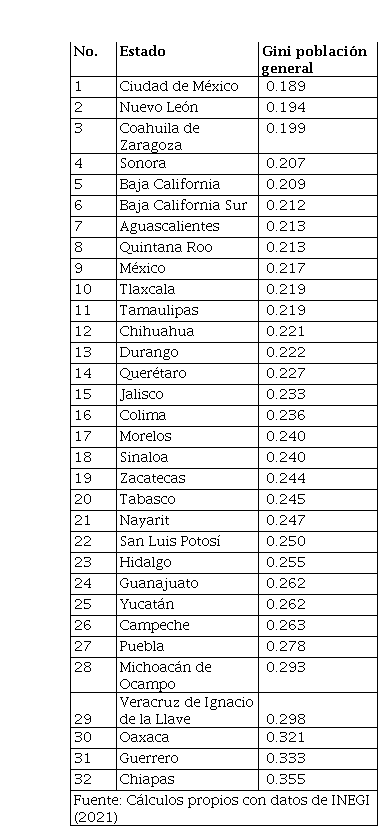 Resumen: Esta investigación, con aspiraciones descriptivas, tuvo por objetivo medir la desigualdad educativa, a través de la distribución de la escolaridad, para los casos de las entidades federativas mexicanas. Para ello se utilizó una adaptación del coeficiente de Gini y datos censales recabados durante el año 2020. Los resultados sugieren que las condiciones de mayor desigualdad se encontraron en los estados de Chiapas, Guerrero, Oaxaca, Veracruz y Michoacán. Las condiciones más igualitarias de ubicaron en la Ciudad de México, Nuevo León, Coahuila y Sonora. Por otro lado, al medir los coeficientes de manera separada para hombres y mujeres, se encontró que, pese a que las diferencias son poco significativas, en 19 de los 32 estados, la desigualdad fue más pronunciada entre la población femenina, siendo esta diferencia más acentuada en Oaxaca, Chiapas y Guerrero.