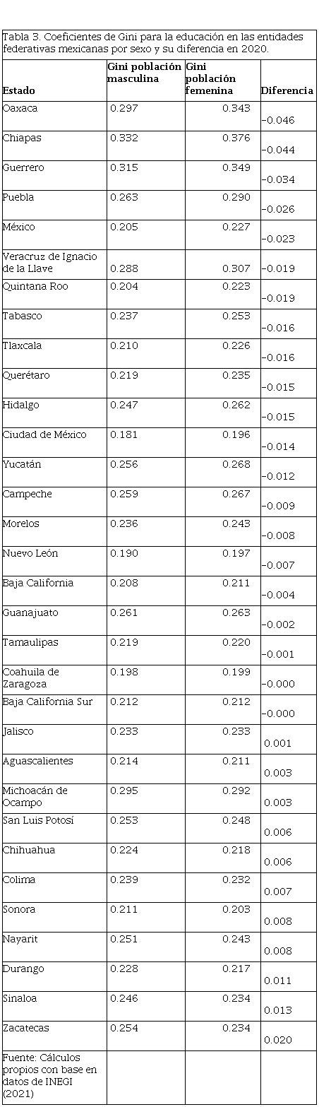 Coincidentemente, en los estados de Oaxaca, Chiapas, Guerrero y Puebla se detectó que la desigualdad afectó de manera más pronunciada a las mujeres que a los hombres, aunque puede decirse que, en general, los coeficientes de Gini para la educación son bastante uniformes para ambos sexos.