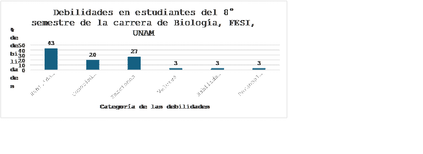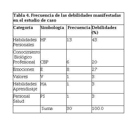 Se presentan en la tabla 4 las categorías establecidas para las debilidades, con sus frecuencias y porcentajes de las 5 categorías que se formaron después de enlistarse todas las debilidades manifestadas por los estudiantes.