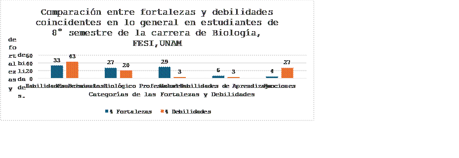 Los estudiantes universitarios de Biología de la FESI-UNAM presentan diversas fortalezas y debilidades que influyen en su experiencia educativa y en su desarrollo personal. Esta investigación exploró las fortalezas y debilidades de estudiantes del último semestre, analizando tanto sus cualidades como los desafíos que enfrentan. Identificar fortalezas y debilidades en jóvenes universitarios implica reconocer cualidades, actitudes y habilidades que les otorgan ventajas laborales. Las fortalezas, valoradas y demandadas en ciertos contextos, pueden basarse en valores éticos, capacidad de comunicación, carácter, aptitudes o personalidad (Sánchez, 2020). Las habilidades personales, que incluyen la gestión del tiempo, la resiliencia y la comunicación efectiva, son cruciales para el éxito universitario y profesional (Mendoza, 2015). En octavo semestre, los estudiantes cursaron la asignatura de Profesionalización en Biología, donde realizaron un análisis FODA para identificar las fortalezas y debilidades desarrolladas a lo largo de sus vidas.