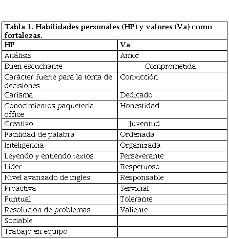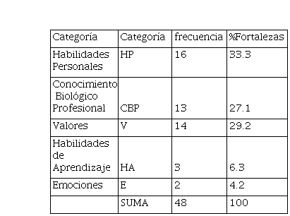Al realizar los listados de las fortalezas y al categorizarlas en orden alfabético se pudo perfilar que las más predominantes fueron las de las habilidades personales y las de los valores (tabla 1), Algunas de ellas se pueden integrar como la buena escucha, el carisma, la facilidad de palabra, la inteligencia, el liderazgo, la proactividad lo sociable y el trabajar en equipo, marcando un perfilo de fututo biólogo con ventajas.