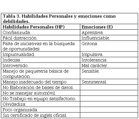 Pasando a los resultados de las debilidades se puede mostrar en la tabla 3, las habilidades personales como debilidad, en las que se puede conjuntar, por ejemplo; la falta de iniciativa en la búsqueda de oportunidades, lo indeciso, lo introvertido y el no trabajo en equipo satisfactorio, lo cual al conjuntarse hacen más débil en la proporción que poseen estas debilidades.