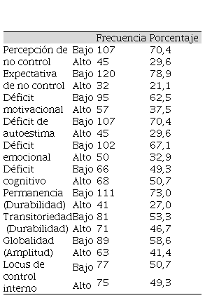 En relación al inventario de desamparo aprendido, las puntuaciones de los sujetos fueron clasificadas siguiendo los criterios propuestos por los autores de la técnica en puntuaciones leves, moderadas, intermedias y altas. Para una exposición más clara, a su vez estas puntuaciones se agruparon en leves o moderadas, por un lado, e intermedias y altas por otro. En la tabla 1 se pueden observar la distribución de los sujetos según este criterio. Como dato significativo se destaca que las dimensiones “Permanencia” y “Expectativa de no control” son las que cuentan con mayor porcentaje de sujetos con puntuaciones leves o moderadas. Mientras que la variable “Locus de control interno” y “déficit cognitivo” son las que cuentan con mayor porcentaje de sujetos con puntuaciones altas o intermedias.