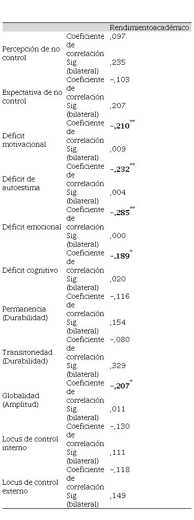 Al realizar las correlaciones bivariadas, entre el rendimiento académico autopercibido y las dimensiones de la desesperanza aprendida, se encontró que la primera variable se correlaciona de manera negativa y significativa con el déficit motivacional (p=,009), el déficit en la autoestima (p=,004), el déficit emocional (p=,000), el déficit cognitivo (p=,020) y con la percepción de globalidad (p=,011) (ver tabla 2).