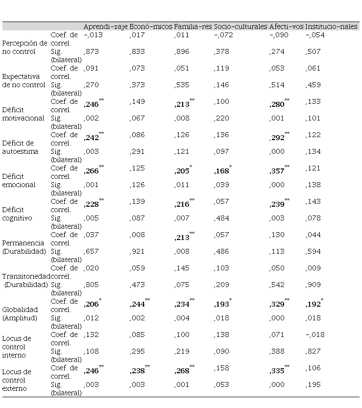 Por otro lado, también se encontraron relaciones significativas entre los problemas reportados por los sujetos y las dimensiones de la desesperanza aprendida. La cantidad de problemas de aprendizaje reportada por los sujetos mostró una correlación positiva con las dimensiones déficit motivacional (p=,002), déficit en la autoestima (p=,003) déficit emocional (p=,001), déficit cognitivo (p=,005), la percepción de globalidad (p=,012) y el locus de control externo (p=,003). Los problemas familiares mostraron correlación con las dimensiones: déficit motivacional (p=,008), déficit emocional (p=,011), déficit cognitivo (p=,007), percepción de estabilidad de la situación aversiva (p=,008); percepción de globalidad (p=,004), y locus de control externo (p=,001). Los problemas afectivos también mostraron una relación positiva con el déficit motivacional (p=,001), déficit en la autoestima (p=,000) déficit emocional (p=,000), déficit cognitivo (p=,003), la percepción de globalidad (p=,000) y el locus de control externo (p=,000).