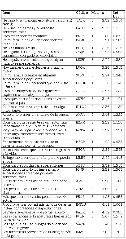 Como se puede observar en la tabla 1, los valores de la mediana demuestran que las creencias relacionadas con el pensamiento mágico oscilan de forma medianamente favorable. Aunque el rango de los valores otorgados va de 1 a 5, es posible comprender que existe una heterogeneidad de respuestas por parte de la muestra, lo cual confirma la media aritmética y la amplia desviación estándar; sin embargo, cabe resaltar que los valores más altos se ostentan en las respuestas sobre la pugna cognitiva entre el razonamiento científico y las creencias mágicas lo cual indica que existe una tendencia a la metacognición y un rechazo, de abierto a moderado, hacia ciertas prácticas ligadas con la analogía y adualismo.