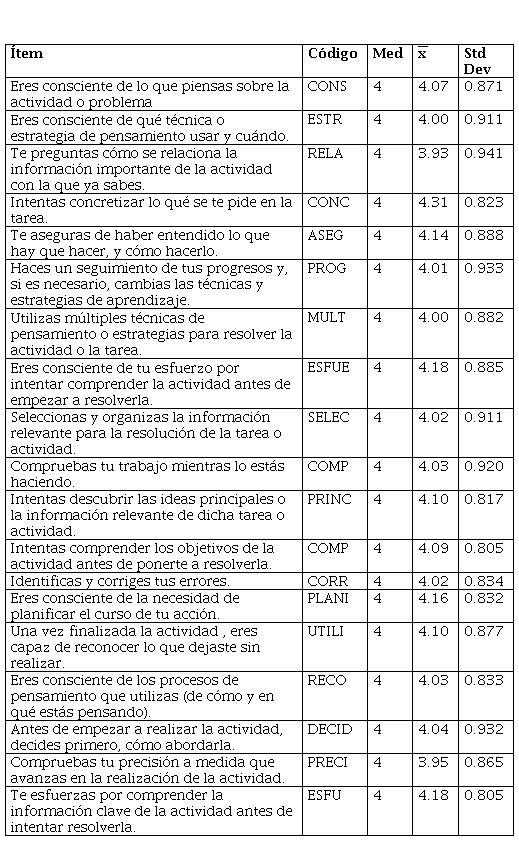 Por otro lado, y a diferencia de la anterior, la tabla 2 expone uniformidad en los valores de la mediana, que monopolizaron el valor 4 que, de acuerdo con Vallejos, et al. (2012), implica que la metacognición la emplean muchas veces en su vida diaria, lo cual es confirmado por la ubicación, en estos mismos resultados, de la media y la desviación estándar, que es mucho más estrecha. Es así que, de acuerdo con estas medidas, los valores más altos están relacionados con el esfuerzo de comprensión antes de resolver cualquier actividad antes de resolverla, el cual está muy ligado con el reactivo INFLU de la escala de PM.