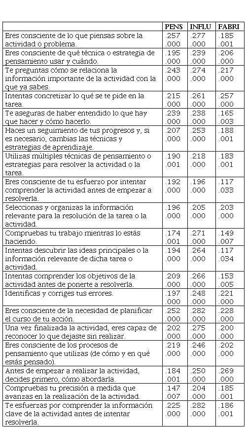 Para profundizar en este vínculo, se pudo identificar que no existe correlación entre el puntaje total de PM y el obtenido en MC (r=0.091, p= 0.095). Respecto al resto de ítems que componen ambos instrumentos, se pudo identificar que existieron tres reactivos del PM que se correlacionaron con todos los ítems del inventario de estrategias de MC, que se presenta a continuación en la tabla 3.