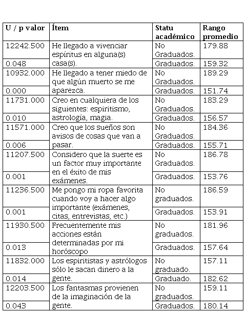 En primer lugar, se reagruparon las clasificaciones brindadas para la muestra en torno a dos grupos: graduados (n=150) y no graduados de pregrado o licenciatura (n=186). Como se podrá comprobar en la tabla 4, los ítems identificados como significativos fueron relacionados con el escepticismo, lo cual explica que, según el rango promediado, los graduados se muestran más escépticos con los ítems relacionados con el adualismo y el animismo respecto a los no graduados. De igual manera, como se observa en la tabla 5, los graduados muestran mayor afinidad, según el rango promedio, por los reactivos ligados al autoconocimiento y realización.