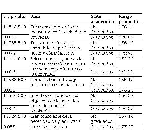 El hecho de que tres ítems pertenecientes al factor ‘razón versus magia’ (Petra y Estrada, 2014) se vinculen significativamente, pero de modo débil, con todo el ‘Inventario de Estrategias Metacognitivas’ (Vallejos, et al., 2012) revela que ambos procesos, el cognitivo – mágico y metacognitivo, guardan una relación intrincada en la muestra, el cual, para conocer cómo se generaba esta relación, se debió profundizar comparando resultados e identificando diferencias.