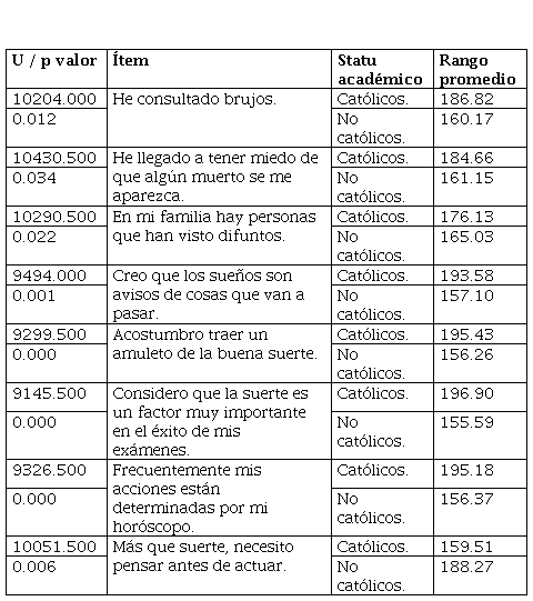 Por otro lado, no se encontraron diferencias significativas con la clasificación original de la muestra por religiones ni tampoco fue factible realizar un análisis factorial: esta misma situación se repitió en una primera reagrupación como practicantes de fe o no practicantes. Es por lo anterior que se decidió reagruparlos por segunda vez como católicos y no católicos y, al correr la prueba U Mann Withney, se encontraron diferencias significativas en ítems relacionados con el adualismo y el animismo, como se puede observar en la tabla 6; incluso, los resultados arrojados develan que los no católicos puntuaron alto en el ítem PENS, mismo que es parte de la pugna razón versus magia y que correlacionaron significativamente con la MC: sin embargo, no se encontraron diferencias significativas entre católicos y no católicos respecto al último constructo mencionado.