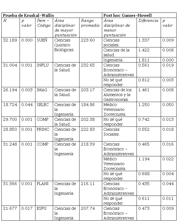 Respecto a las diferencias encontradas de forma significativa, con valores menores a 0.05, respecto al PM y a la MC, sucedió en cuanto a la procedencia muestral desde diferentes disciplinas, lo cual se puede evidenciar en la tabla 7 que los estudiantes y profesionales del área de Ciencias Químico Biológicas muestran mayor puntuación en el ítem SUEÑ; en tanto, los discentes y egresados de las Ciencias de la Salud puntuaron más alto en reactivos relacionados con el cuestionamiento de las creencias mágicas y, a su vez, junto con la población de Ciencias Sociales y de la Ingeniería, fueron los que puntuaron más bajo en dichos reactivos del PM, con diferencia significativa respecto del alumnado y los graduados de carreras Económico – Administrativa, Gastronomía y aquellos quienes no se pudieron identificar en alguna área disciplinar en específico.