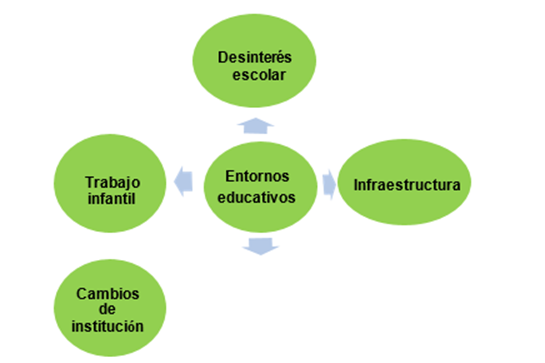La familia entornos educativos, presenta la categoría desinterés escolar por parte de los estudiantes en su proceso de aprendizaje, donde no se siente entusiasmado, no cuenta con la energía necesaria para aprender, situación que lleva al bajo rendimiento escolar, no presentar actividades, es decir agudiza aún más la problemática de la deserción escolar en los distintos entornos educativos. De ahí que los entrevistados desde su rol de estudiantes consideran que “Si” (ENT- ED10 - FVV), mostrándose como una de las causas para abandonar los estudios e Institución Educativa.