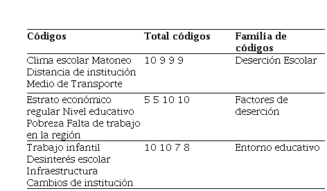 La cual se aplicó mediante entrevistas a profundidad con un total de 10 estudiantes (jóvenes menores de 18 años) de una institución educativa rural en el municipio de Samaniego, siendo un proceso metodológico en donde extrae datos relevantes y significativos en la identificación de conceptos más comunes en las respuestas otorgadas por los participantes. Llevando entonces a presentar códigos con sus respectivas familias como también las veces que se repiten a la hora de responder de acuerdo su apreciación con la deserción escolar.