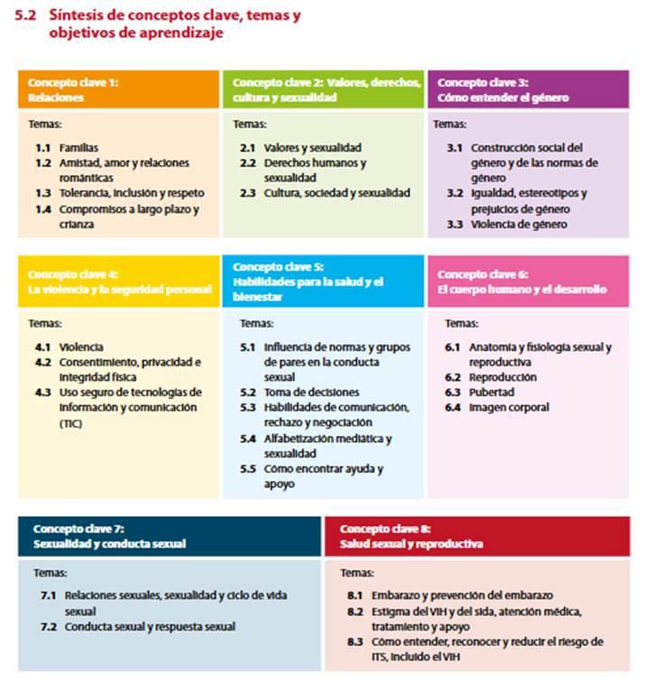 De acuerdo con las Orientaciones, el objetivo de la EIS es dar a los niños y jóvenes “conocimientos basados en datos empíricos, habilidades, actitudes y valores que los empoderarán para disfrutar de salud, bienestar y dignidad; entablar relaciones sociales y sexuales basadas en el respeto; analizar cómo sus decisiones afectan su propio bienestar y el de otras personas; y comprender cómo proteger sus derechos a lo largo de su vida y velar por ellos” (Organización de las Naciones Unidas para la Educación, la Ciencia y la Cultura [UNESCO], 2018, p. 3). Para asistir a los gobiernos en el diseño de planes y programas de estudio de educación sexual, la UNESCO propone ocho conceptos clave, cada uno con sus temas (Organización de las Naciones Unidas para la Educación, la Ciencia y la Cultura [UNESCO], 2018. Ver Anexo 1). Los temas incluidos en los conceptos clave pretenden dar a los niños y jóvenes habilidades, conocimientos y actitudes que los empoderen para realizar su salud, bienestar y dignidad, entender sus derechos y actuar en consecuencia, y respetar los derechos de los demás. La UNESCO desarrolló estos conceptos clave y temas, basada en evaluaciones de currículos existentes en 12 países, y en consultas mundiales con expertos. Algunos de los conceptos clave y temas incluidos en las Orientaciones son el 6: El cuerpo humano y el desarrollo (incluye los temas 6.1 Anatomía y fisiología sexual y reproductiva; 6.2 Reproducción; 6.3 Pubertad y 6.4 Imagen corporal) y el 8: Salud sexual y reproductiva (incluye los temas 8.1 Embarazo y prevención del embarazo, 8.2 Estigma del VIH y del sida, atención médica, tratamiento y apoyo, y 8.3 Cómo entender, reconocer y reducir el riesgo de ITS, incluido el VIH).