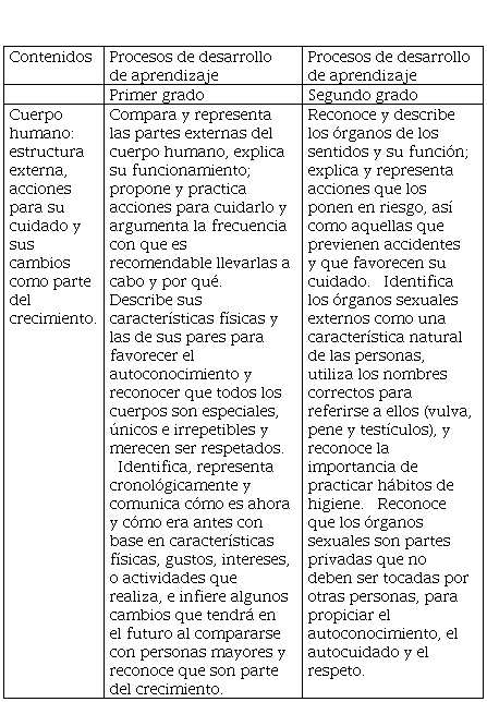 Acerca de la estructura externa del cuerpo humano, los PDA de primer grado incluyen la comparación y representación de las partes externas del cuerpo humano y la explicación de su funcionamiento; en segundo grado, la identificación de los órganos sexuales externos y la utilización de los nombres correctos para referirse a ellos. En lo que concierne a las acciones para el cuidado del cuerpo humano, los PDA de primer y segundo grado incluyen propuestas de aprendizaje relacionadas con la higiene y con la integridad física. A propósito de las primeras, los PDA de primer grado sugieren que los estudiantes propongan prácticas para cuidar el cuerpo y argumenten la frecuencia con la que deben llevarlas a cabo; en segundo grado, los PDA sugieren el reconocimiento de la importancia de practicar hábitos de higiene. En cuanto a la seguridad personal, en primer grado, los PDA proponen el reconocimiento que todos los cuerpos son especiales y merecen ser respetados; en segundo grado, el reconocimiento de que los órganos sexuales son partes privadas que no deben ser tocados por otras personas. A propósito de los cambios del cuerpo humano como parte del crecimiento, los PDA de primer grado incluyen la identificación por parte del estudiante de cómo es ahora y cómo era antes con base en características físicas y gustos e intereses, y la inferencia de algunos cambios que tendrá en el futuro al compararse con personas mayores. Los procesos de aprendizaje de segundo grado no incluyen los cambios del cuerpo como parte del crecimiento.