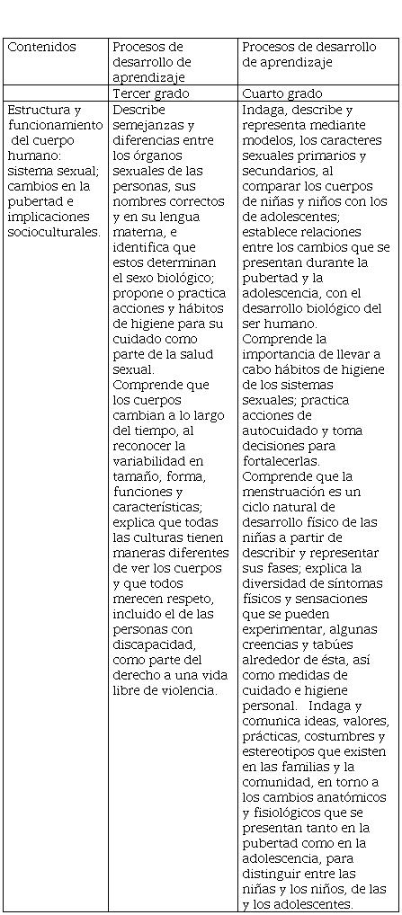 A propósito de los cambios como parte del crecimiento, los PDA de tercer grado incluyen la comprensión de que los cuerpos cambian a lo largo del tiempo y el reconocimiento de la variabilidad en tamaño, características y funciones; los de cuarto, proponen que los estudiantes establezcan relaciones entre los cambios anatómicos y fisiológicos que se presentan durante la pubertad y la adolescencia, y la diferencia entre las y los adolescentes. Sobre el tema de los cambios como parte de crecimiento, los PDA de cuarto grado incluyen a la menstruación, la comprensión de que esta es un ciclo natural de desarrollo físico de las niñas y la explicación de los síntomas físicos y sensaciones que se pueden experimentar, así como algunas creencias y tabúes alrededor de ésta.