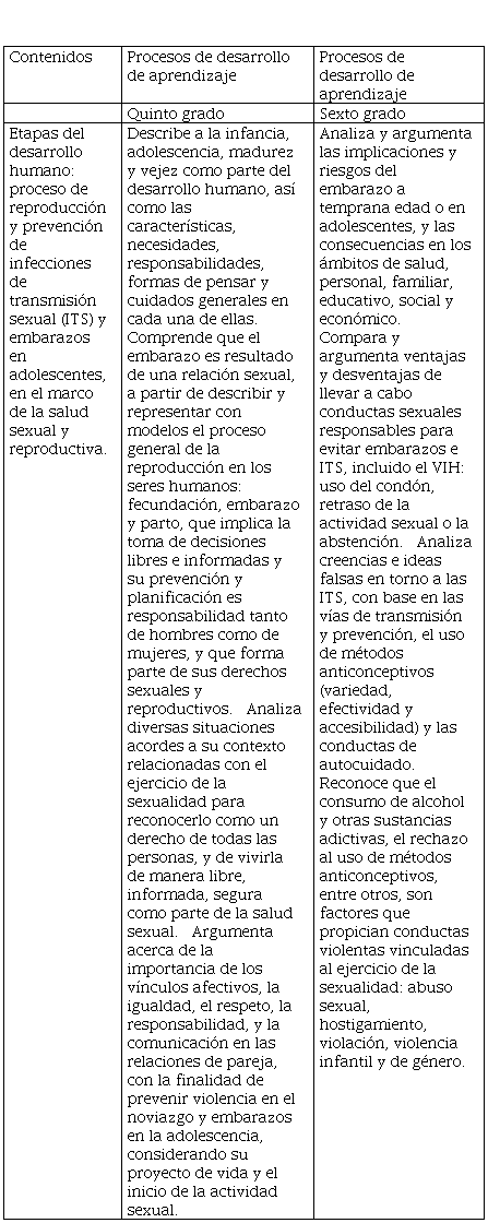 Sobre las etapas del desarrollo humano solo hay un PDA en quinto grado: la descripción de “la infancia, adolescencia, madurez y vejez como parte del desarrollo humano, así como las características, necesidades, responsabilidades, formas de pensar y cuidados generales en cada una de ellas” (Secretaría de Educación Pública [SEP], 2024d, p. 40). No hay un PDA en sexto grado vinculado a las etapas de desarrollo humano. En cuanto al proceso de reproducción, los PDA de quinto grado incluyen la comprensión de que el embarazo es resultado de una relación sexual, y la descripción, con modelos, del proceso general de la reproducción en los seres humanos incluyendo la fecundación, el embarazo y el parto. Los PDA de sexto grado no incluyen al proceso de reproducción.