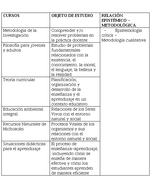 La interacción interdisciplinar y el análisis filosófico-epistemológico de cada una de las asignaturas diseñadas, llevó al cuerpo académico a concretar una propuesta, con el mismo sentido tanto horizontal como vertical (ver tabla 1), referir un trabajo en conjunto revela una congruencia tanto epistémica como metodológica en cada uno de los cursos.