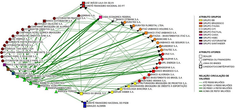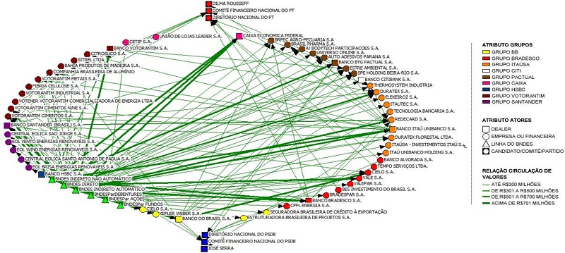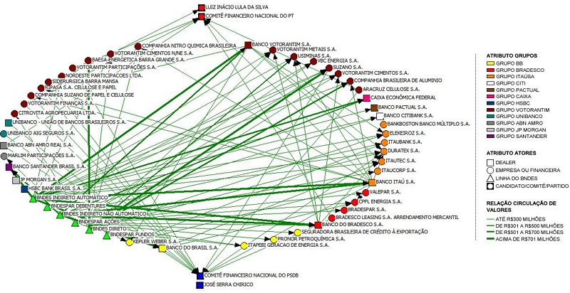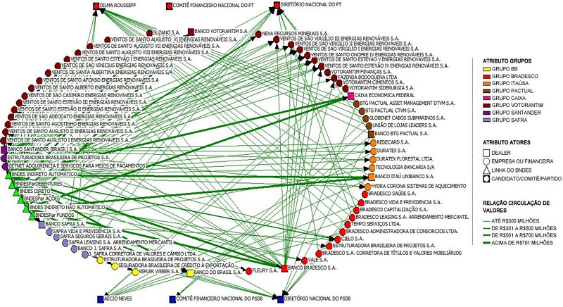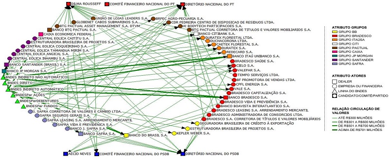De modo geral, nesta etapa foram identificadas as empresas financeiras e não financeiras que mais atuaram no mercado de títulos públicos brasileiros e que tiveram relevante participação junto ao BNDES, ou seja, em dois importantes mercados do sistema financeiro nacional. Trata-se dos atores que, inseridos na rede, movimentaram os fluxos financeiros, comprando títulos, recebendo créditos e/ou intermediando os recursos do BNDES. Assim, a investigação do financiamento privado das campanhas eleitorais para presidência se tornou ponto central, indicando ou não a atuação política dos agentes econômicos identificados.