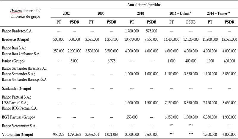 Após a investigação realizada no Repositório de Dados Eleitorais do SPCE, disponíveis no sítio eletrônico do TSE, foram cruzados os dados das empresas identificadas nas etapas anteriores da pesquisa com as planilhas contendo as receitas das campanhas presidenciais de 2002, 2006, 2010 e 2014 e seus doadores. Sistematizando os valores das doações realizadas pelas instituições financeiras e empresas vinculadas aos seus grupos, a tabela abaixo apresenta as doações realizadas pelas principais instituições financeiras dealers e pelas empresas vinculadas aos grupos que atuaram junto ao BNDES durante cada pleito, considerando as campanhas eleitorais dos dois principais partidos/candidatos. Para o pleito de 2014, optou-se pela inclusão de duas colunas contendo, em cada uma delas, os valores financeiros doados pelos atores verificados ao final do segundo governo Dilma e ao final do governo Temer.