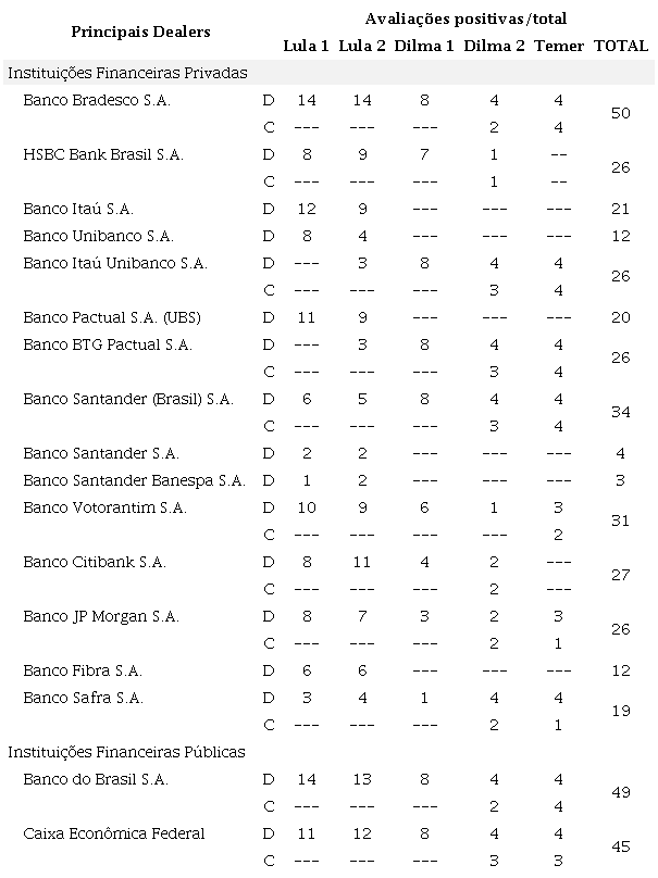 De modo geral, o grupo dos dealers é composto por instituições financeiras nacionais e estrangeiras, públicas e privadas, e corretoras ou distribuidoras de títulos e valores mobiliários independentes. A participação nos leilões promovidos pelo Bacen e pela STN, bem como o volume de recursos investidos nos papéis, são critérios para a renovação do credenciamento dessas instituições a cada seis meses, o que lhes confere favorecimentos, como a participação exclusiva nos chamados leilões de segunda volta2. Como os valores investidos são sigilosos, a investigação foi realizada a partir da soma das avaliações positivas do Bacen e da STN sobre a atuação das instituições financeiras dealers nos leilões, identificando as que atuaram por maior tempo e, consequentemente, que realizaram maiores investimentos.