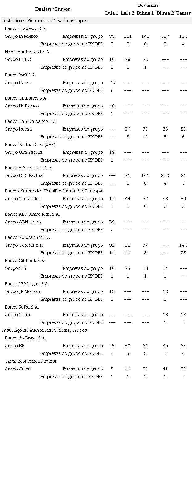 A tabela a seguir indica as principais instituições financeiras dealers em cada governo, o grupo econômico e/ou financeiro ao qual cada instituição se vinculava, o número de empresas que compunham o grupo ao final de cada governo e o número de empresas que receberam algum aporte e/ou que atuaram como agente financeiro intermediário do BNDES.