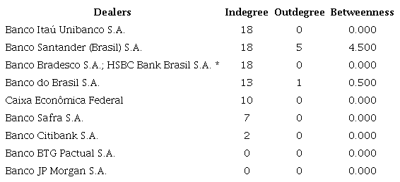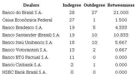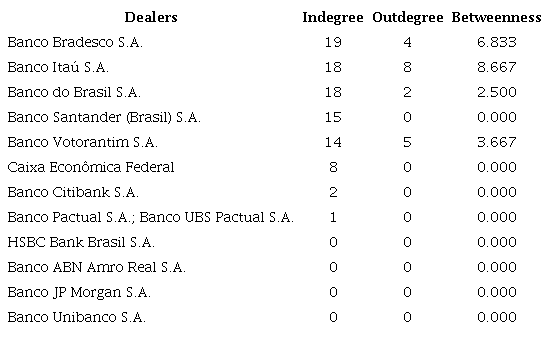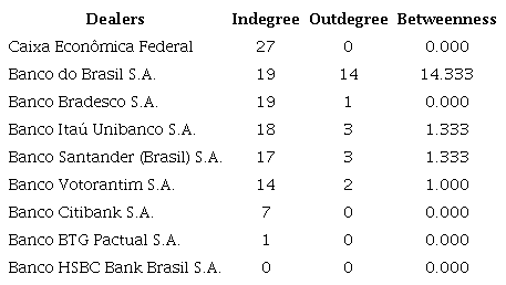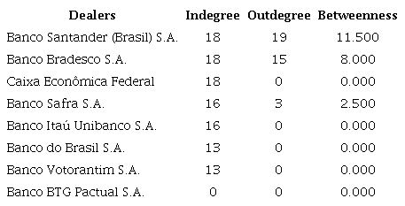 Considerando apenas os fluxos financeiros entre as instituições financeiras identificadas no mercado de títulos públicos e no BNDES, foram adotados o degree e o betweenness como métricas de centralidade. A escolha da relação e de tais métricas se pautou na possibilidade de identificação não apenas da circulação dos recursos entre os atores, mas da intensidade com que tais instituições financeiras, com grande participação no mercado de títulos públicos, atuaram como agentes intermediários dos recursos do BNDES na rede. O papel de agente intermediário, neste caso, confere às instituições financeiras credenciadas pelo BNDES a cobrança de spread bancário, ou seja, uma sobretaxa aos juros cobrados na origem pelo Banco, agregando relativo lucro com a atividade. A intermediação destes recursos dentro da rede sinaliza uma maior concentração de capital nos mesmos agentes.