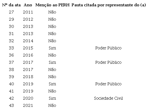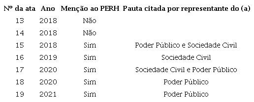 O quadro acima demonstra que, nas reuniões ordinárias, o Plano Estadual foi pautado na maioria das vezes pelo Poder Público; apenas no ano de 2020, há representação da sociedade civil pautando o Plano no Conselho. Na ocasião, o conselheiro solicitou que os programas que trouxessem impactos ambientais, a exemplo do programa de perfuração de poços realizado pela SEMARH, denominado RN+ Águas fosse inserido no PERH para que houvesse um monitoramento rigoroso da disponi-bilidade do recurso hídrico subterrâneo. Além disso, o conselheiro atentou para outras questões que não constam nos produtos da revisão do Plano.
