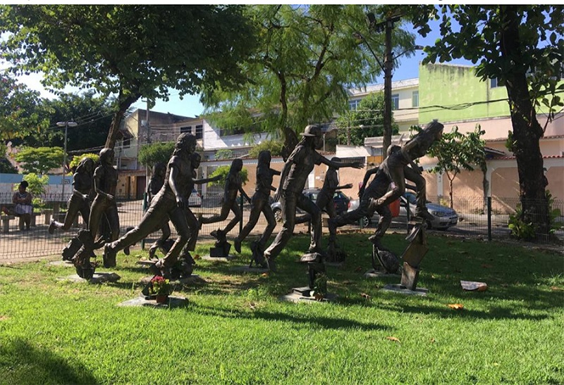 Localizada entre ruas calmas do bairro de Realengo, a Praça Anjos da Paz quase passa despercebida por quem percorre o local. Não fossem as 11 esculturas de bronze erigidas na esquina das ruas Jornalista Marques Lisboa e Almirante Clemente Pinto, não haveria vestígios da tragédia ocorrida em 7 de abril de 2011. A praça ganhou esse nome a fim de homenagear as vítimas do episódio que ficou conhecido como “Massacre de Realengo”, ocorrido na escola Tasso da Silveira, quando um ex-aluno atirou em diversos estudantes deixando doze adolescentes mortos. As esculturas, que ocupam uma área de cerca de 31,5 m², estão fixadas num jardim ao lado da escola, reformado após o massacre. O caso foi massivamente veiculado pela mídia e o que sabemos sobre o atirador, ou as razões que motivaram o crime parecem acrescentar ainda mais comoção ao caso. A interação com tais esculturas se dá pela intrínseca relação que produziram na memória do bairro se tornando um símbolo homônimo, que ao contrário do “Alô, alô Realengo Aquele Abraço”, referência primária ao se mencionar o nome do bairro, também o massacre passou a conImagemr enquanto lembrança imediata quando se fala em Realengo (BAPTISTA, 2023).