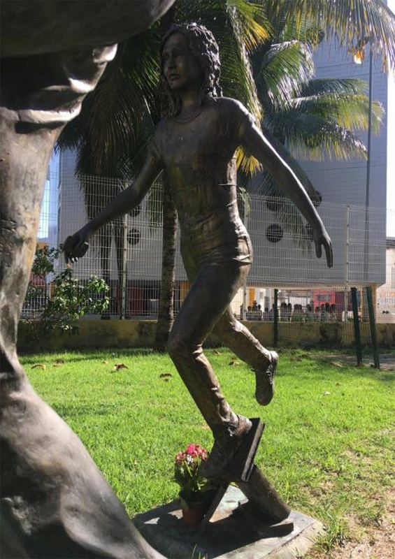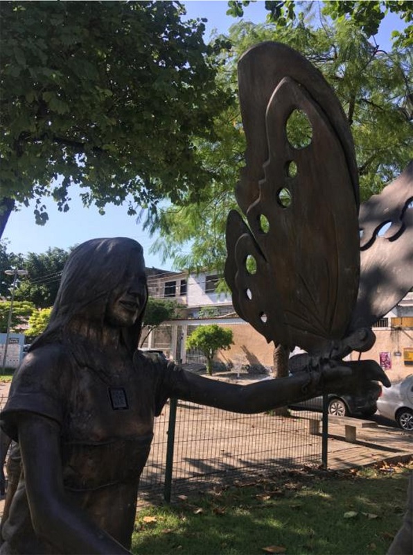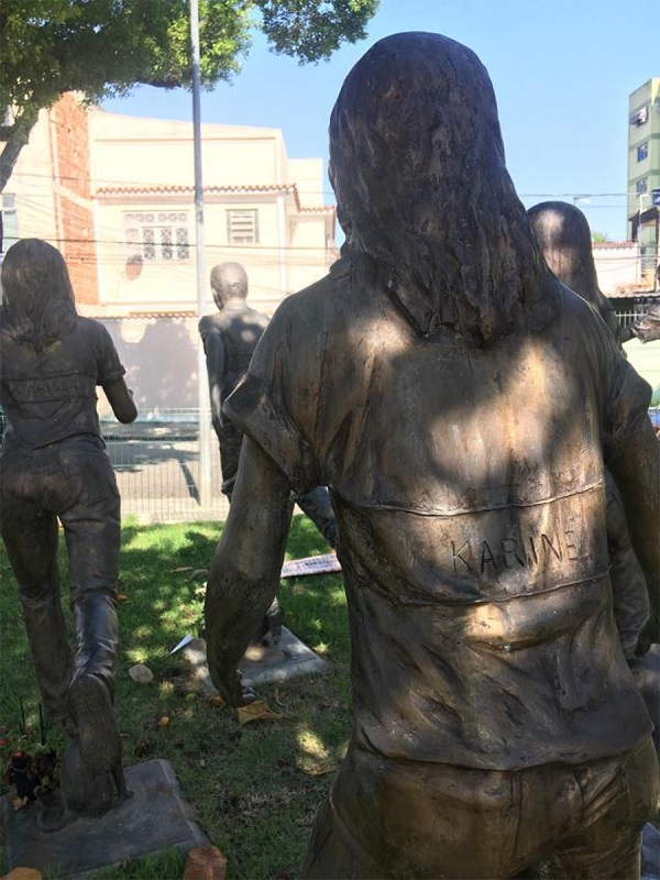 Para Adriana da Silveira, mãe de Luiza, uma das vítimas, é importante que as estátuas sejam construídas não apenas como impedimento ao esquecimento, mas como um mecanismo de combate à violência. Adriana também ressalta que essa homenagem ajuda a dar sentido a tudo que aconteceu: “é um pequeno consolo”. O relato da mãe ajuda a pensar memoriais mortuários como espaços de lembrança que possuem características compartilhadas por ritos fúnebres e religiosos. Como vemos na imagem a seguir, até hoje, mais de 10 anos depois da tragédia, flores frescas são colocadas aos pés das estátuas, algo semelhante ao que ocorre em lápides funerárias. Vale dizer que o caráter de altar está aqui notabilizado, a materialidade sustenta a continuidade da memória de vivos e mortos, em um aspecto semelhante ao que ocorre com a interação/devoção às imagens de santos, apontado por Menezes (2004). Como na foto acima, as flores foram postas na base da estátua evidenciando reciprocidade, devoção, e continuidade da relação entre vivos e mortos.