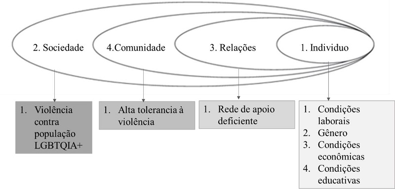 Nível social: no nível social foram identificados 7 elementos e integrados em três categorias, sendo a mais relevante a violência contra população LGBTQIA+.