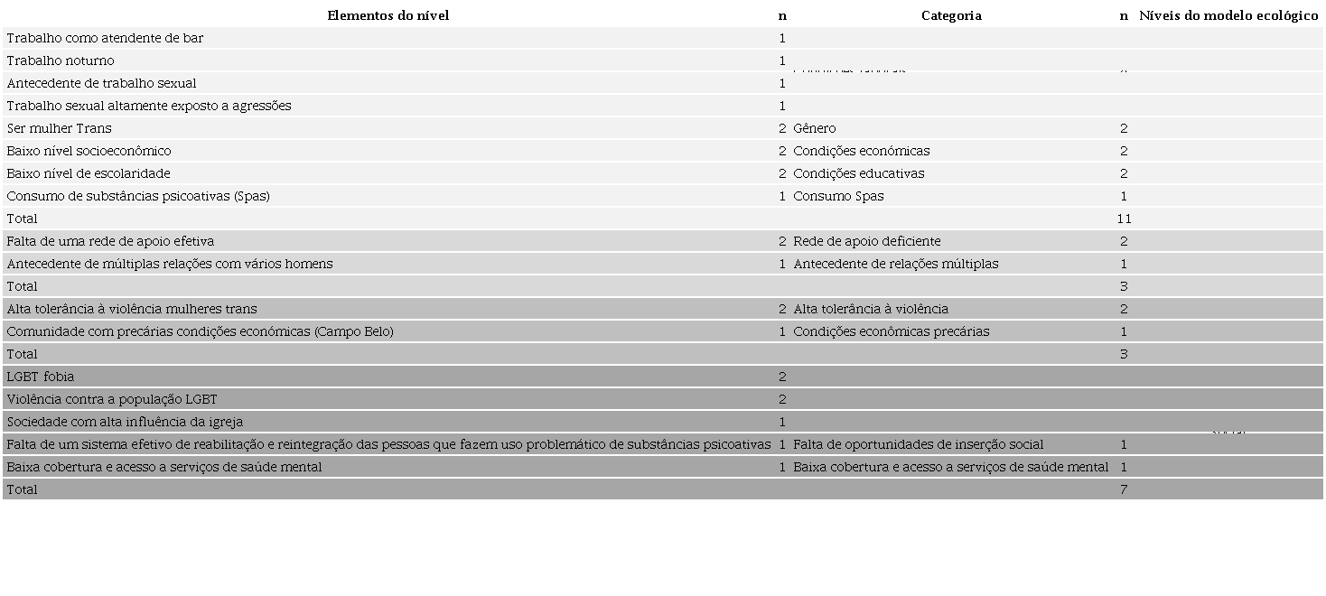 Nível comunitário: identificaram-se no nível comunitário três elementos integrados em duas categorias, sendo a mais relevante a alta tolerância à violência contra as mulheres trans.