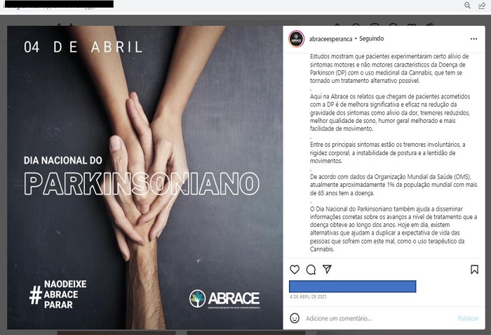 De acordo com Zandavalle (2018), o Instagram possui um fluxo de informações visual que transmite significados por meio de imagens, textos e hashtags, que são usados conforme o contexto e a informação que se quer passar adiante. Em uma postagem no dia 4 de abril de 2021, o perfil da Abrace tratava do Dia Nacional do Parkinsoniano. Na imagem (Figura 1), é possível ver mãos entrelaçadas, a logo da Abrace e a hashtag “#Naodeixeabraceparar”. Na legenda, fala-se que já existem estudos que mostram que os pacientes sentem alívio de sintomas motores e não motores decorrentes da Doença de Parkinson com o uso de Cannabis. Argumenta-se que diariamente chegam relatos das pessoas que usam os produtos feitos na associação e têm melhoras significativas de dores, tremores, sono e humor. Trazem-se ainda estudos produzidos pela Organização Mundial da Saúde (OMS) que afirmam que 1% da população com mais de 65 anos desenvolveu a doença. No final da descrição, afirma-se que esse dia é importante para que possam ser disseminadas informações corretas sobre os tratamentos da doença e mostrar que atualmente existem formas de aumentar a expectativa de vida dessas pessoas com o uso terapêutico de Cannabis. Apesar de se falar em estudos, no plural, não se elenca nenhuma referência mais específica para que os seguidores possam conferir.