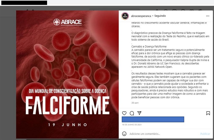 Em 19 de junho de 2021, o perfil da Abrace fez uma postagem (Figura 2) sobre o Dia Mundial de Conscientização sobre a Doença Falciforme. Essa doença é genética e hereditária e se caracteriza por uma alteração das hemácias do sangue que podem causar dores crônicas e infecções, e é mais prevalente em pessoas pretas e pardas17. Na legenda, fala-se da relação entre a Cannabis e a doença, afirmando que o tratamento é seguro e eficaz na doença crônica de pacientes. Citam um ensaio clínico feito pelos pesquisadores Kalpna Gupta e Donald Abrams na Universidade da Califórnia, mas não deixam o acesso mais facilitado ao conteúdo integral do texto. Evidencia-se que os resultados do ensaio mostraram que a Cannabis parece ser segura no tratamento da dor crônica decorrente da doença falciforme e, além disso, mostra-se que os autores do teste afirmam que a substância pode ajudar no combate à crise de saúde pública relacionada ao uso abusivo de opioides.