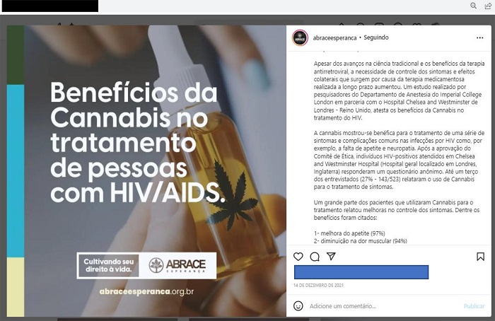 Em outra postagem publicada em 14 de dezembro de 2021, a Abrace discorre sobre os benefícios da Cannabis no tratamento do HIV/Aids. Com os benefícios e efeitos colaterais da terapia antirretroviral, surgiram também formas de controle desses sintomas. Na imagem (Figura 3) é possível ver um frasco que remete ao óleo produzido pela associação e a folha da Cannabis em destaque. Na postagem, a associação fala sobre um estudo realizado no Imperial College London em parceria com o Hospital Chelsea and Westminster em Londres no qual se atestam os benefícios da Cannabis no tratamento do HIV. De acordo com a legenda feita pela associação, o estudo se baseou em um questionário anônimo respondido por pessoas soropositivas atendidas no hospital. Na legenda é descrito que a substância se mostrou eficaz para combater uma série de sintomas e complicações nas infecções por HIV, como a falta de apetite e a neuropatia. Segundo a postagem, foram relatadas também melhorias em dores musculares (94%) e nos sintomas da depressão (86%). Por fim, ainda na legenda, afirma-se que é importante reconhecermos o papel que a Cannabis desempenha no tratamento prolongado de pessoas soropositivas. Não há informações mais precisas sobre o estudo em si, nem referências ou indicações de onde ele possa ser lido.