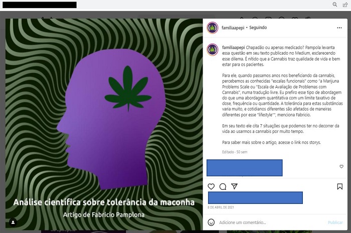 Em 8 de abril de 2021, a Apepi fez uma postagem sobre um texto produzido pelo pesquisador Fabrício Pamplona20. A imagem (Figura 4) mostra o título do artigo, o desenho de uma cabeça humana em tons de roxo e a folha da maconha dentro da cabeça na cor verde. Na legenda, inicia-se a postagem com a questão: “chapadão ou apenas medicado?”. A associação seleciona um trecho específico do texto no qual Pamplona afirma que existem “escalas funcionais”, como a Escala de Avaliação de Problemas com Cannabis, que evidenciam como a tolerância à substância varia entre indivíduos diferentes. Ela também pode mudar em cotidianos e estilos de vida diversos. A associação deixa o link para que o seguidor possa acessar o texto e conhecer as sete situações sobre as quais Pamplona discorre no tocante ao uso prolongado de Cannabis. Entre 2020 e 2021, ao analisar o conteúdo das postagens da associação, percebi que o nome do pesquisador se repetia em algumas delas. Talvez a proximidade do pesquisador das pautas em relação ao uso terapêutico de Cannabis faça com que a Apepi utilize seus textos e artigos para informar seus seguidores sobre doenças e outras questões relacionadas à maconha.