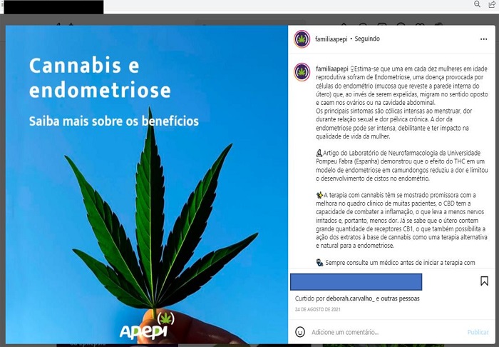 Em outra postagem, feita em 24 de agosto de 2021, o perfil da Apepi discorreu sobre os benefícios da Cannabis no tratamento da endometriose. Essa é uma doença que atinge mulheres em idade reprodutiva que faz com que as células do endométrio, em vez de serem expelidas, migrem até os ovários e a cavidade abdominal. Isso faz com que algumas mulheres tenham cólicas intensas no período menstrual, dor durante a relação sexual e também desenvolvam uma dor pélvica crônica. Na postagem (Figura 5) que traz em seu centro a folha da Cannabis, a Apepi fala mais especificamente de um artigo feito pelo Laboratório de Neurofarmacologia da Universidade Pompeu Fabra, na Espanha, que demonstra que o THC reduziu a dor e limitou o desenvolvimento de cistos no endométrio em camundongos. Nessa postagem, não se elencam outras referências nem se facilita o acesso ao artigo completo. Afirma-se ainda que o canabidiol, outra substância presente na Cannabis, atua bem em processos inflamatórios, o que auxilia que o paciente sinta menos dor. No fim da postagem, reafirma-se que um médico sempre deve ser consultado antes da utilização de terapias de saúde.