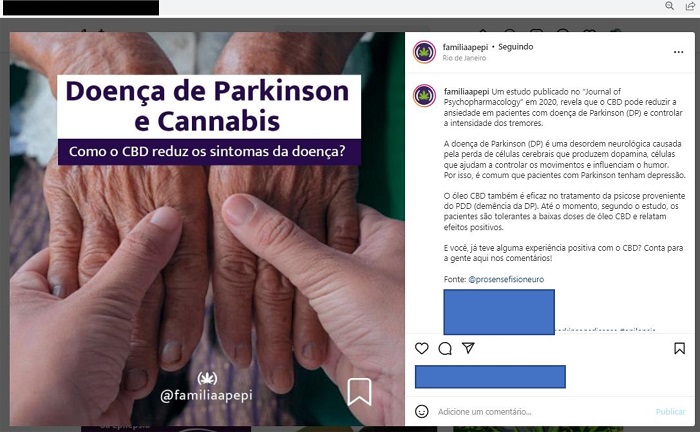 Em 22 de novembro de 2021, o perfil da Apepi publicou uma postagem (Figura 6) sobre a doença de Parkinson e a Cannabis, questionando como o canabidiol pode reduzir os sintomas da doença. Na imagem postada é possível ver duas mãos mais enrugadas seguradas por outro par de mãos. Ao explicar no que consiste a doença, fala-se mais especificamente de um estudo publicado no Journal of Psychopharmacology em 2021 que demonstra que o canabidiol pode reduzir os sintomas da ansiedade em pacientes com Parkinson e também ajudar no controle dos tremores característicos da doença. Fala-se ainda que, segundo o estudo, os pacientes toleram baixas doses de canabidiol em forma de óleo e que têm tido efeitos positivos. Por fim, pede-se que os seguidores deixem nos comentários suas experiências positivas com o uso do composto. Não se especifica quem foram os autores do estudo, nem se deixa o acesso mais facilitado ao artigo. Apesar disso, não só parece que se quer informar os seguidores, mas também interagir com eles e suas experiências de adoecimento e tratamento. Tal ponto mostra como as plataformas digitais podem contribuir para o compartilhamento de experiências em torno da doença e para o fomento de terapias de saúde.
