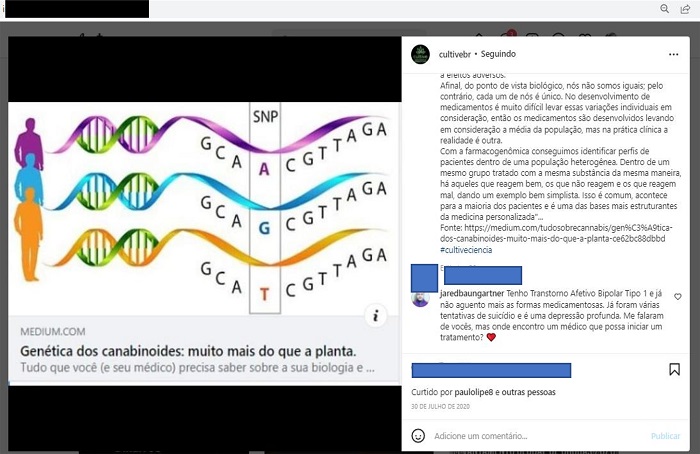 Mais uma vez o nome do pesquisador Fabrício Pamplona aparece, dessa vez em uma postagem (Figura 7) feita no perfil da Cultive em 30 de julho de 2020. A legenda inicia com a chamada do texto: “genética dos canabinoides”. Fala-se da tendência da medicina personalizada e da importância de conhecer o perfil genético de cada um através de testes. De acordo com a legenda, o objetivo seria compreender melhor esse perfil para que fosse designada para cada pessoa específica a melhor composição de canabinoides. A postagem é extensa e traz diversas informações, como o que seria farmacogenômica. Esta seria a ciência que estuda como nosso organismo reage aos princípios ativos de fármacos, ressaltando-se a importância de se conhecer não só a biologia da planta, mas também a do paciente. No final, coloca-se o link para o site no qual o texto está disponível e se encerra a postagem com o uso da hashtag #cultiveciencia. Nesse ponto, o primeiro comentário feito por um usuário é também interessante. A pessoa afirma que tem Transtorno Afetivo Bipolar Tipo 1 e que já não aguenta mais os medicamentos que são receitados. Já tentou suicídio e desenvolveu uma depressão profunda. Pergunta onde poderia encontrar um médico para iniciar o tratamento. O comentário mostra a síntese do trabalho de divulgação da associação: ela informa, o seguidor lê, se interessa, comenta e também se sente à vontade para descrever sua experiência com o adoecimento. Não há só a veiculação da informação, mas também um compartilhamento.