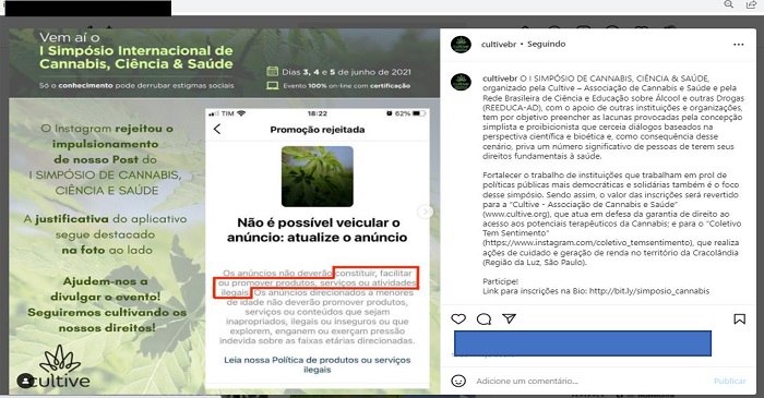 No mês de março, a Cultive fez algumas postagens com o intuito de divulgar o evento intitulado “I Simpósio de Cannabis, Ciência e Saúde” que foi realizado em junho de 2021. O lema do evento era “só o conhecimento pode derrubar estigmas sociais” e seria feito de forma online (Simpósio de Cannabis, Ciência e Saúde, 2021). Em 18 de março de 2021, por meio de uma postagem, a Cultive fez uma reclamação aberta à plataforma Instagram. Na imagem postada (Figura 8) é possível ver uma captura de tela de uma promoção rejeitada pela plataforma. Na imagem a Cultive afirma que o Instagram rejeitou o impulsionamento da postagem com a justificativa de que os anúncios não deveriam tratar de produtos, serviços ou atividades ilegais. A associação pede ajuda aos seus seguidores para divulgar o evento e enfatiza que seguirá “cultivando direitos”. É interessante notar que na legenda a associação diz que o objetivo do evento é preencher lacunas deixadas por uma perspectiva científica e bioética baseadas em uma concepção simplista e proibicionista do uso de Cannabis. Embora use a plataforma para divulgar um evento sobre ciência e saúde, apenas pelo uso da palavra Cannabis ela é acusada de promover atividades ilegais. Mais interessante ainda é que ela continua postando propagandas do evento em diferentes datas, utilizando o mesmo termo, mas o problema não parece ser a postagem si, mas sim o impulsionamento da divulgação do evento.
