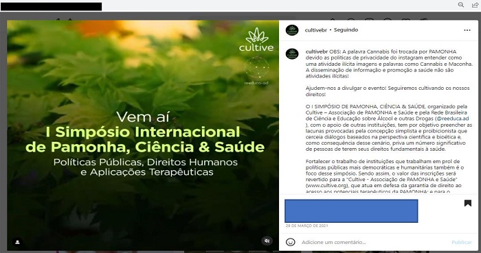 Ainda falando sobre o simpósio, no dia 29 de março de 2021, a Cultive publica uma imagem semelhante àquela da postagem anterior, mas agora trocando a palavra Cannabis por pamonha (Simpósio de Cannabis, Ciência e Saúde, 2021). Na legenda, explica que a troca de termos se deu a partir das políticas de privacidade da plataforma, já que, ao buscarem impulsionar a divulgação das postagens, o Instagram acabava associando as palavras Cannabis e maconha com atividades ilegais. Pede novamente ajuda para divulgar o evento, enfatizando que disseminação de informação e promoção da saúde não deveriam ser vistas como atividades ilícitas. Nesse caso, a Cultive não só informa seus seguidores sobre um evento que discutirá temas importantes como o uso terapêutico de Cannabis, ciência e saúde, mas também faz jogos de palavras para que a plataforma não identifique do que está tratando a postagem. Constituem também um tipo de denúncia, que ganha ainda mais força quando a associação afirma que falar de ciência e saúde não é atividade ilegal.