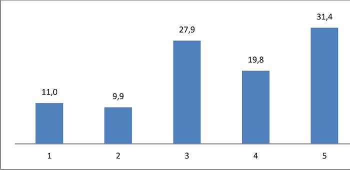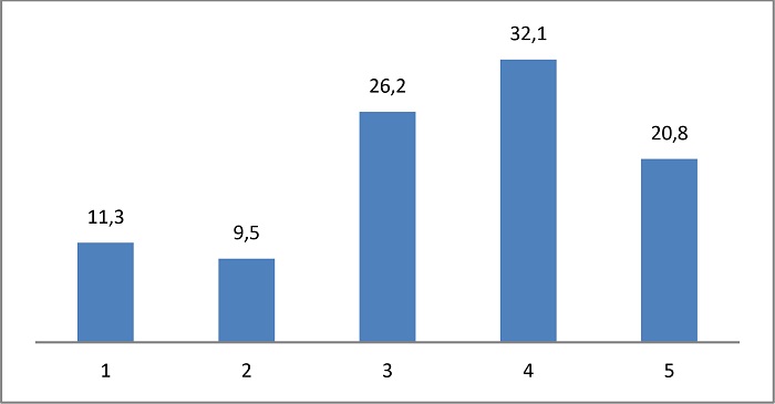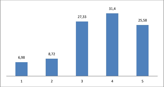 Apesar das dificuldades mencionadas, o gráfico 1 mostra que os estudantes entrevistados se consideram muito adaptados à nova rotina escolar. Em uma Escala Likert de 1 a 5, na qual 1 representa pouco adaptado e 5 muito adaptado, os resultados mostram um forte grau de adaptação, com a maior concentração de respostas nos níveis 3, 4 e 5 da escala.